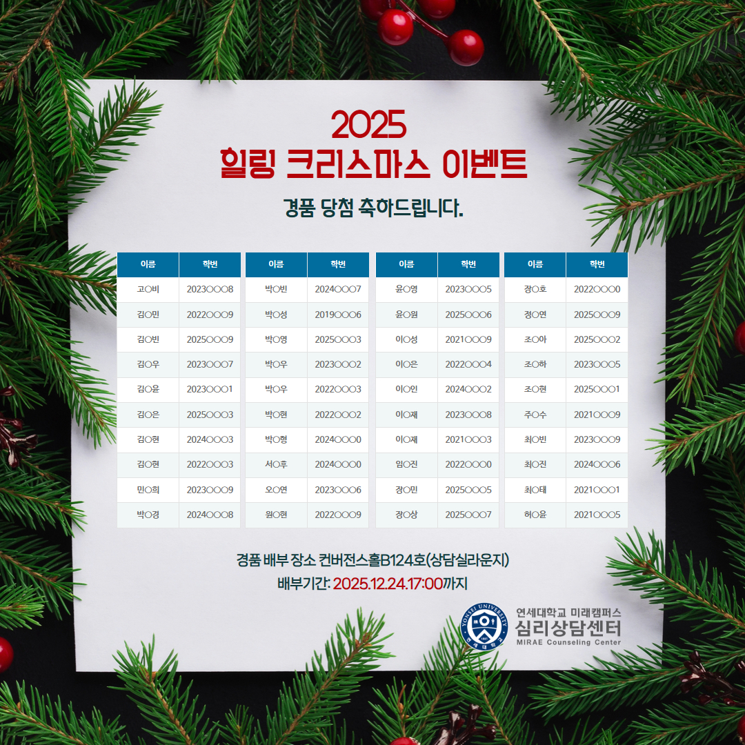 당첨되신 분들은 2025년 12월 24일까지 상담실라운지(컨버전스홀 B124호)에 들려서 경품을 꼭 수령해 주시기 바랍니다.