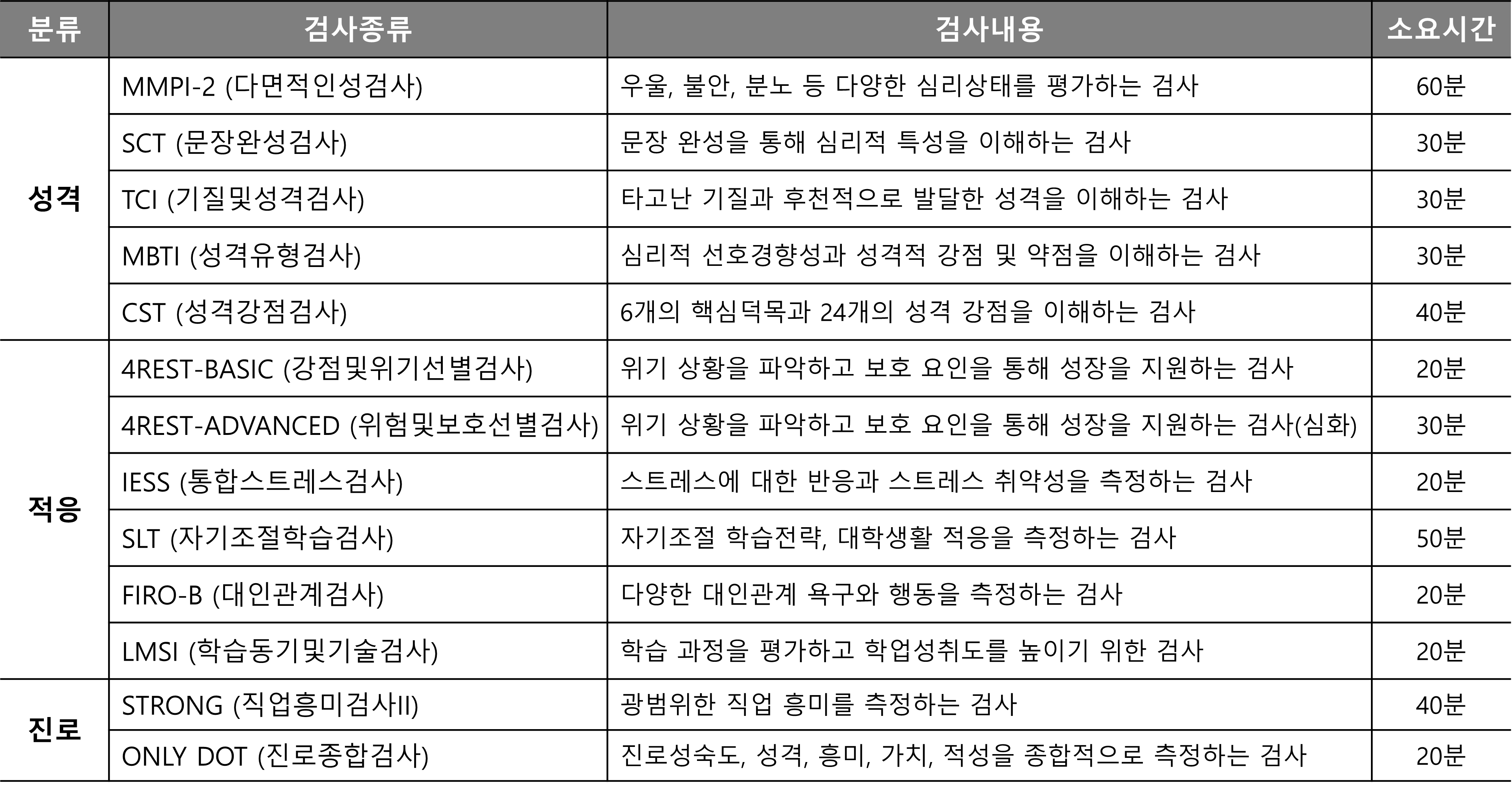 성격, 진로, 학습, 등 다양한 종류의 심리검사를 진행합니다. 심리상담센터에서 제공하는 심리검사 목록은 아래와 같습니다.